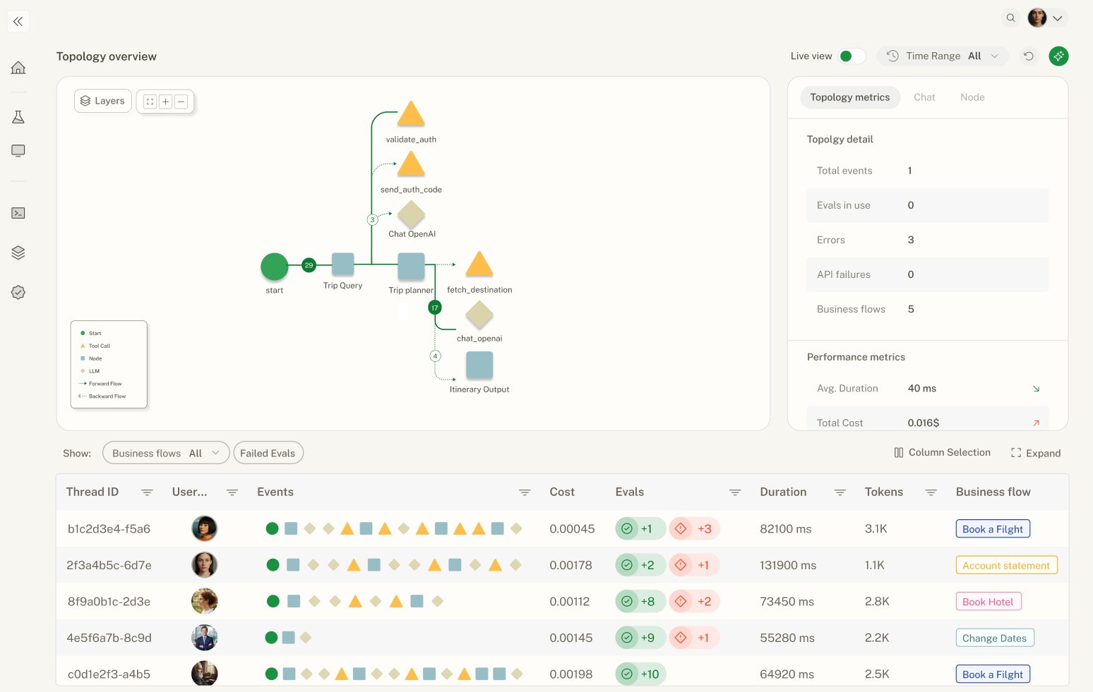 Real-time visibility into agent behavior, topology, and business impact.